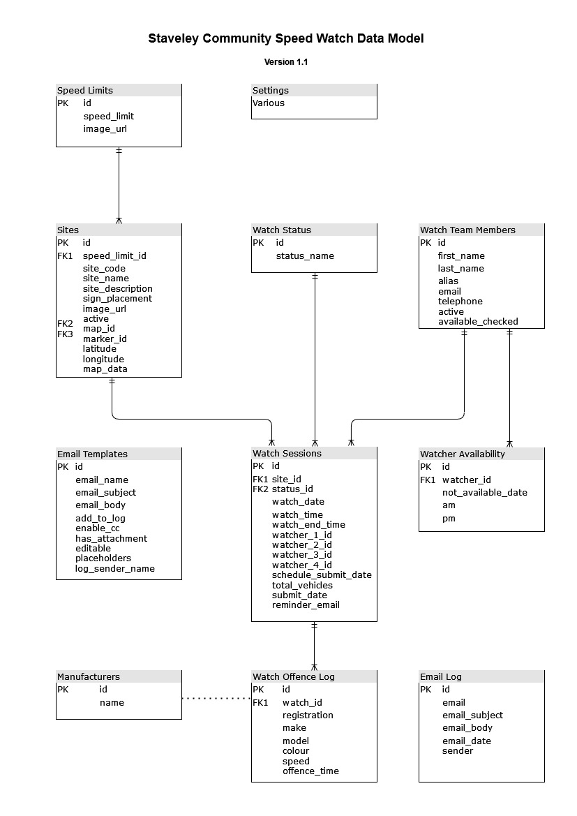 The diagram below shows the data entities and attributes as used by the Staveley Community Speed Watch Team. The entities are stored as tables in the database behind this website and the data is maintained in the Admin section of the website.